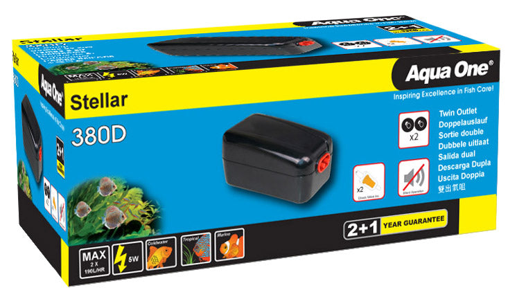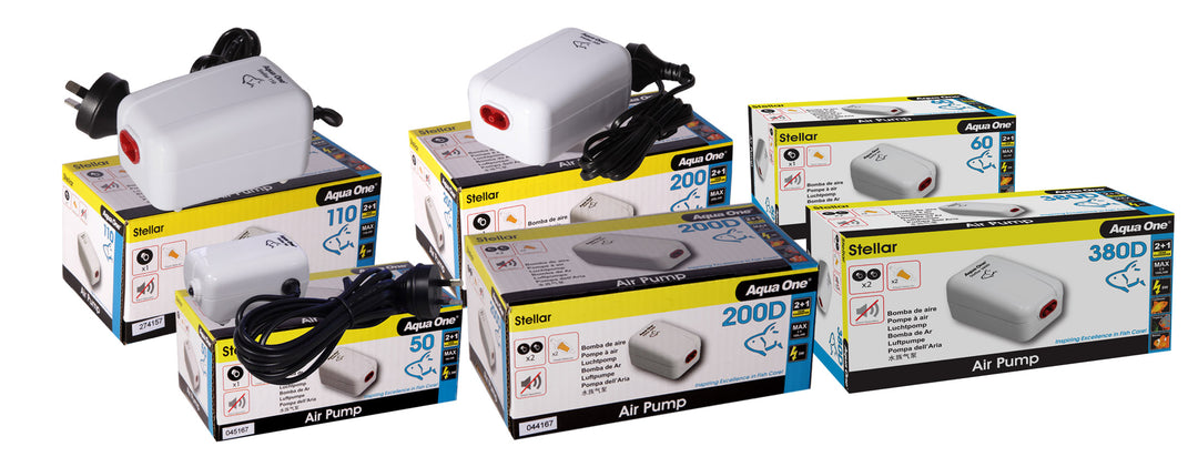 Aqua One Stellar Air Pumps will help you provide the necessary oxygen within your aquarium, creating a healthy environment for your fish. Stellar Air Pumps are quiet, powerful and energy efficient.