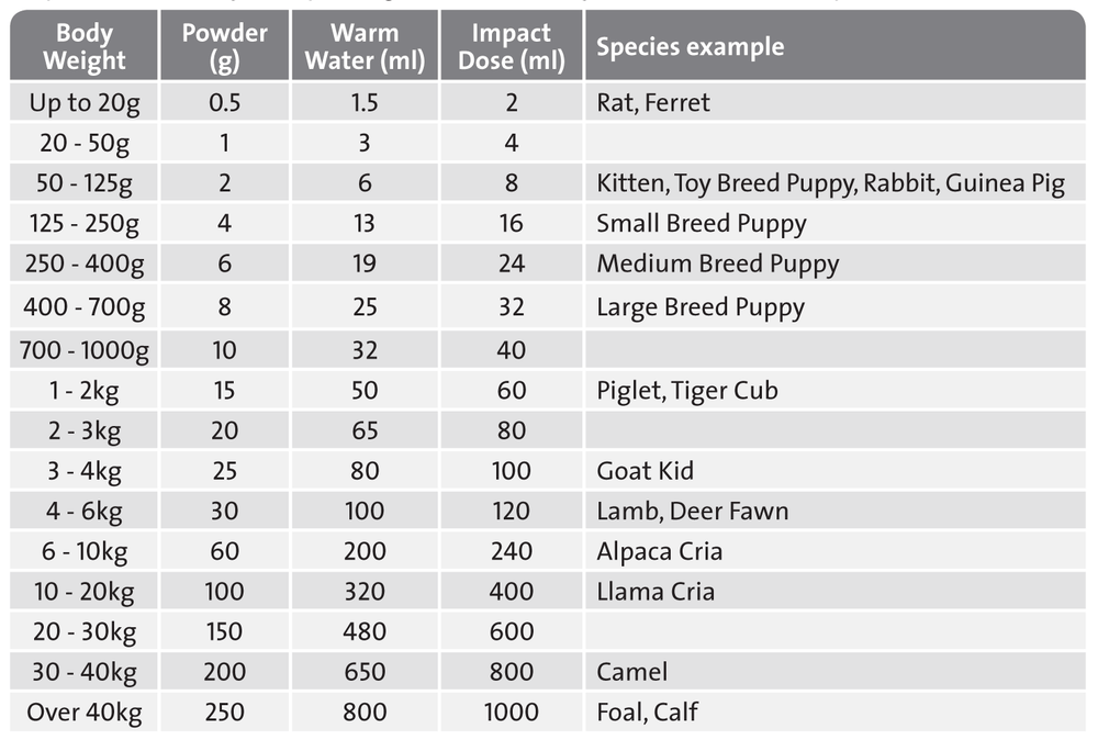 12 to 48 hours after birth: Commence feeding milk. Prepare an Impact Dose as described above and feed ¼ of the amount every 4 hours, in between milk feeds.