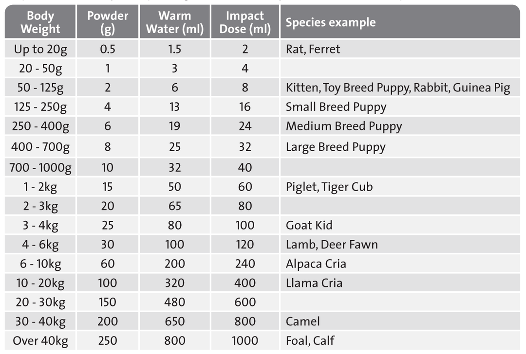 Concentrated Dose: Add 5g of Impact powder (5 moderately heaped spoons) per 100mL of milk fed. Repeat for up to 5 days, every 4 weeks, as necessary. Ensure joeys are well hydrated prior to feeding. Use when animals initially come into care, for sick or stressed animals or just prior to first pouch emergence (Wombaroo Age Factor of 0.6).